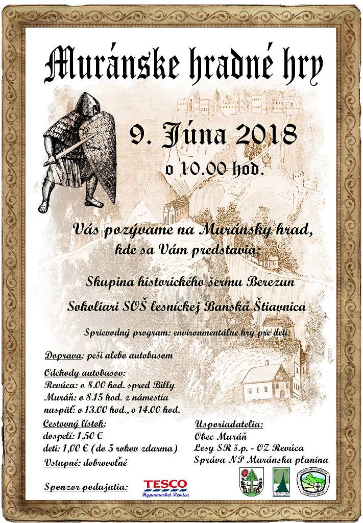 V sobotu, 9. júna, sa na Muránskom hrade môžete vrátiť v čase. O pohľad do minulosti a nezabudnuteľný zážitok sa na hradných hrách postará Skupina historického šermu Berezun. Zaujímavé bude aj vystúpenie Sokoliarov SOŠ lesníckej Banská Štiavnica a sprievodné environmentálne hry pre deti. Z iného súdka bude program nasledujúcej soboty (16.6.) v Lesíku pri Rimavských Zalužanoch. Poľovnícke združenie Kraskovo tu organizuje Poľovnícky deň, v rámci ktorého sa uskutoční Svätohubertská svätá omša a súťaž vo varení poľovníckeho guľášu. K dobrej nálade zahrá ľudová hudba a heligonkári.