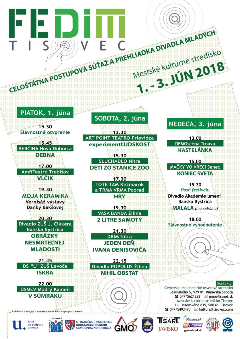 V Tisovci ponúknu prvé júnové dni sériu divadelných predstavení a zážitkov. V priebehu troch dní (1. až 3.6.) sa v rámci celoštátnej postupovej súťaže a prehliadky divadla mladých pod názvom FEDIM Tisovec predstaví 13 divadelných súborov z celého Slovenska. Ako hosť pred slávnostným vyhodnotením vystúpi Divadlo Akadémie umení Banská Bystrica s monodrámou Malala. Súčasťou podujatia bude aj výstava Danky Bakšovej - Moja keramika, ktorej vernisáž je naplánovaná na piatok, 1. júna. Po úspešnej aprílovej premiére sa do Mestského domu kultúry v Revúcej opäť vráti komédia Mefisto v podaní ochotníckeho súboru Komedia Rev. Na divadelnej hre v maskách sa môžete zabaviť vo štvrtok, 7. júna. Presne o týždeň (14.6.) odštartuje Sobotský Jazztival, ktorý predstavuje sériu 9 koncertov - exkluzívnych hudobných lahôdok, ktoré si budete môcť vychutnávať postupne počas celého leta. Ako prvá na nádvorí Čierneho orla vystúpi americká speváčka Audrey Martells s hudobným sprievodom Walter Fischbacher Trio. Druhý z koncertov na seba nenechá dlho čakať, uskutoční sa v poslednú júnovú sobotu (30.6.). Môžete sa tešiť na svojskú slovenskú pesničkárku Katarziu a pesničky z jej albumu Agnostika. Ešte pred tým však Rimavskú Sobotu navštívia herci Radošinského naivného divadla s inscenáciou Besame mucho. Ak si absurdnú komédiu Stanislava Štepku o tom, čo sa skrýva v kufri (a v nás), nechcete nechať ujsť, do kalendára si poznačte piatok, 22. júna. Na druhý deň (23.6.) už v okresnom meste vystúpi jedna z najúspešnejších maďarských rockových skupín - Omega.
