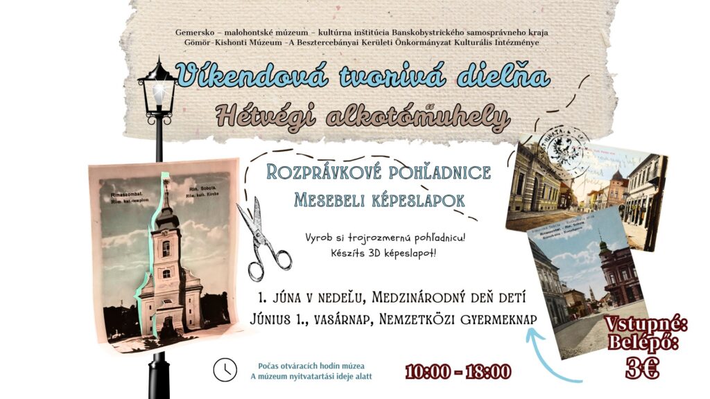 Tvorivejšie deti môžu prvého júna navštíviť Gemersko-malohontské múzeum, kde bude od 10:00 do 18:00 prebiehať dielňa rozprávkových pohľadníc. Deti si tu môžu vyrobiť vlastnú trojrozmernú pohľadnicu z historických motívov a odniesť si tak originálnu pamiatku na svoj deň. Vstupné na dielňu je 3 eurá.