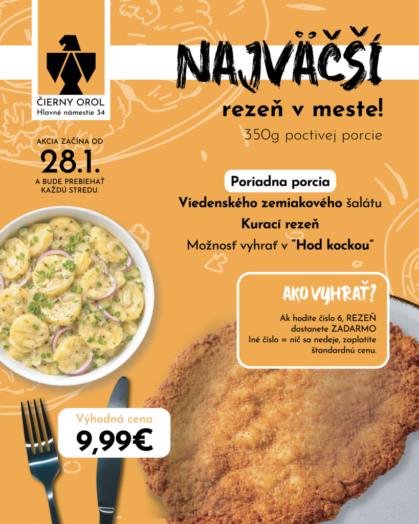 A to nie je všetko, v Čiernom orlovi majú radi všetko najväčšie, od stredy bude totiž pripravený NAVÄČŠÍ REZEŇ V MESTE! Všetko z poctivého mäska a s obľúbeným Viedenským zemiakovým šalátom. A čo je najlepšie, aj tu budete mať možnosť, hodiť si kockou. Tak čo, odhodláte sa?
