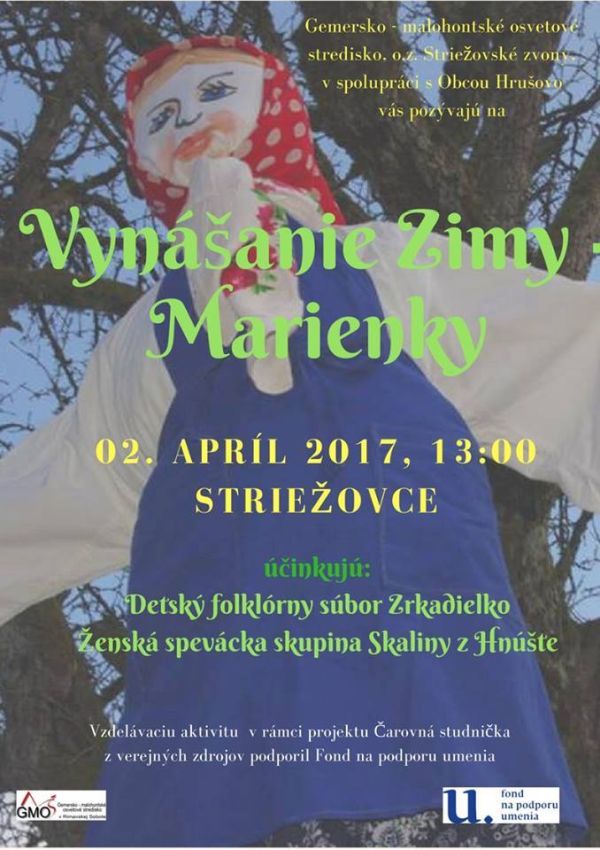 Vynášať Zimu Marienku budú aj v obci Striežovce, a to v nedeľu, 2. apríla. A ako to bude prebiehať? Ako uvádzajú organizátori slamená bába sa na hornom konci dediny oblečie do šiat, nastokne sa na hrubý štiap a nesie sa dole dedinou za spevu charakteristickej pesničky Hój, Marienka, hój…V sprievode idú všetci účastníci. S Marienkou sa príde na dolný koniec dediny, tam sa vyzlečie, ostane slamené torzo, to sa zapáli, dievka, ktorá sa chce do roka vydať preskočí horiacu Marienku ako prvá, potom preskakujú ďalšie. Marienka sa nakoniec hodí do potoka a zima z dediny odíde. V sprievodnom programe, o ktorý sa postaralo Gemersko-malohontské osvetového stredisko v Rimavskej Sobote, sa predstaví Detský folklórny súbor Zrkadielko a Ženská spevácka skupina Skaliny z Hnúšte.