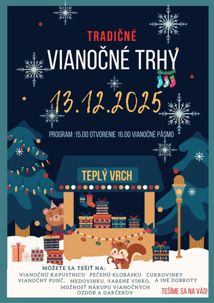 Predstavte si dokonalú predvianočnú atmosféru. Presne takú sľubujú organizátori na Teplom Vrchu 13. decembra 2025. Dedina opäť ožije tradičnými vianočnými trhmi a tento deň bude patriť vôni Vianoc, svetielkam a tej pravej sviatočnej atmosfére! "Jednoducho popoludnie plné chutí, vôní a zimnej pohody," uvádza obec na sociálnej sieti.