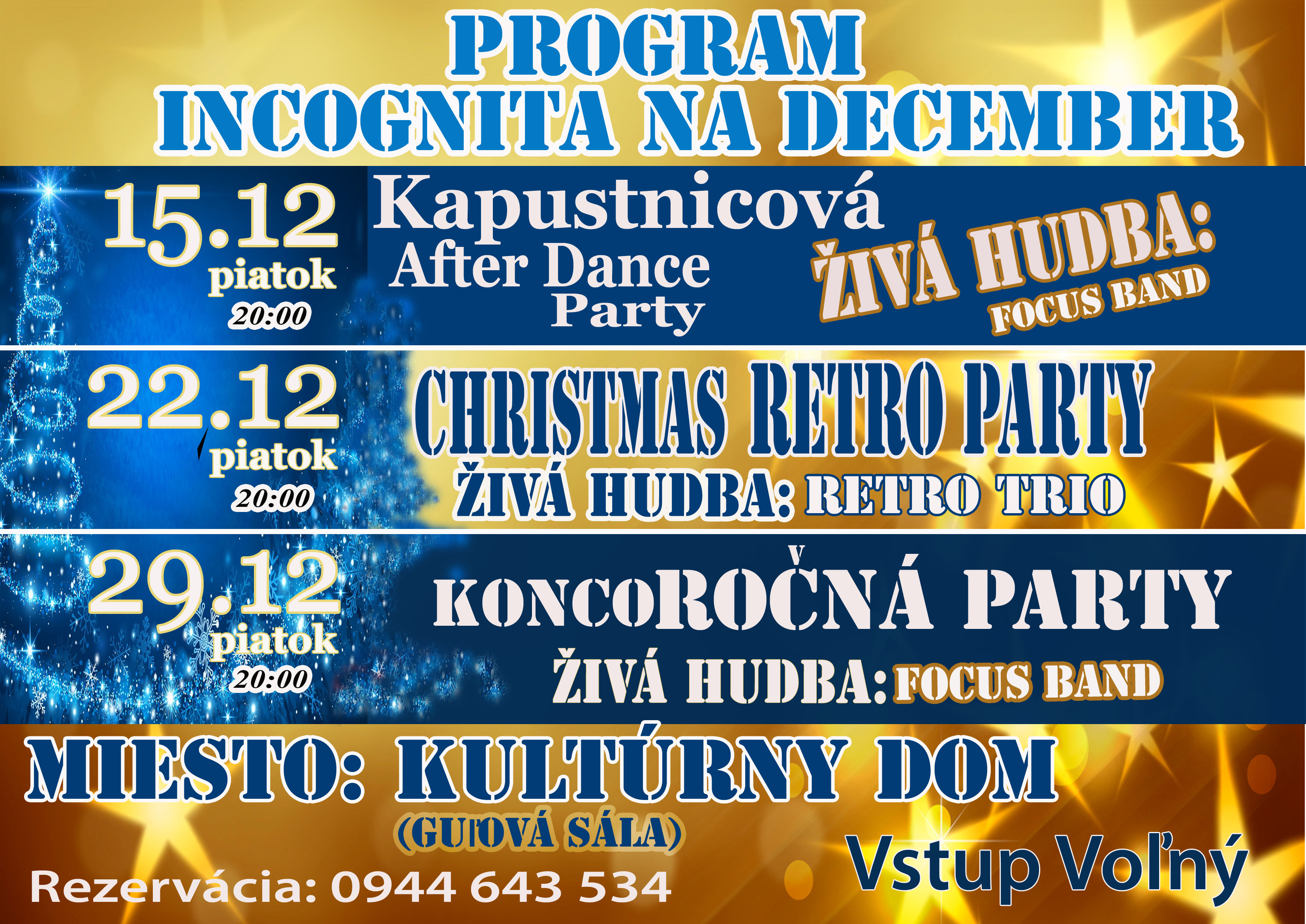 Už zajtra, po súťaži vo varení vianočnej kapustnice na Hlavnom námestí, čaká všetkých návštevníkov veľká After Party.Incognito After Dance Party začína o 20:00 hod v Guľovej sále Domu kultúry. Do rytmu bude hrať živá kapela Focus Band. Neváhajte a zažite kapustnicovú After-ku Incognito.