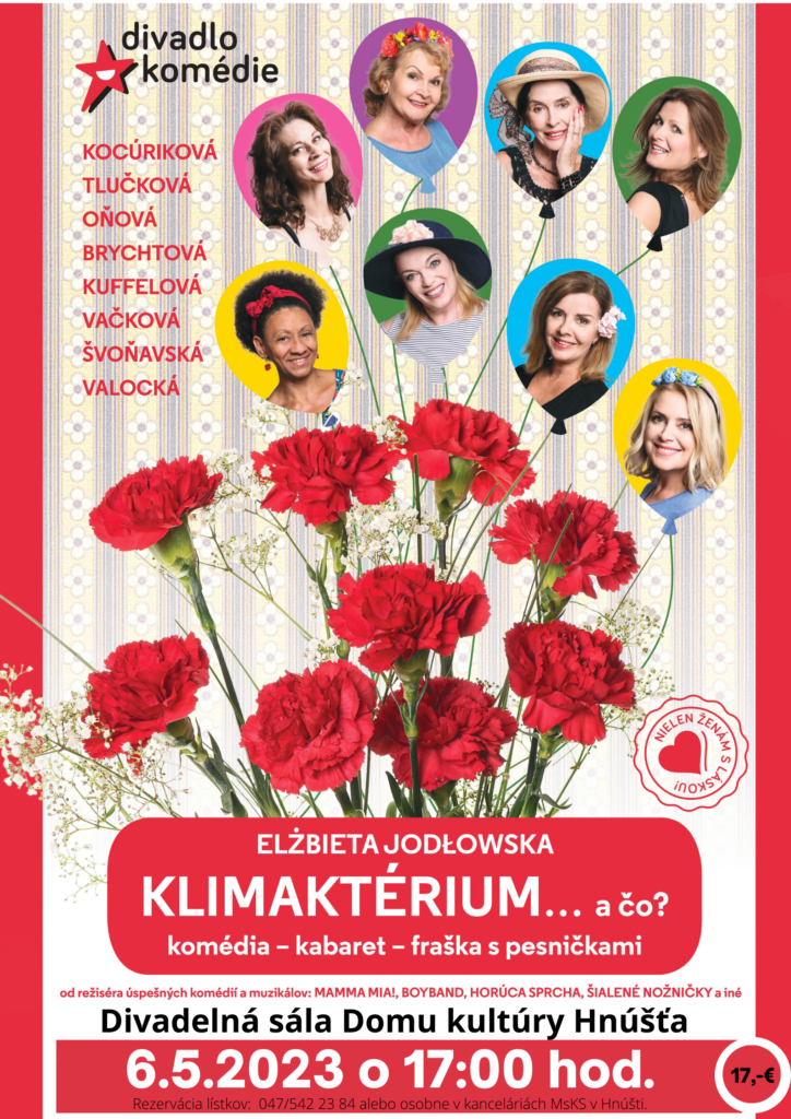 HNÚŠŤA – Mestské kultúrne stredisko Hnúšťa vám dáva do pozornosti divadelnú hru KLIMAKTÉRIUM... a čo?! V obsadení kabaretnej hry sa objavujú zvučné mená ako napríklad Zuzana Kocúriková, Zuzana Tlučková, Gizka Oňová, Katarína Brychtová, Zuzana Vačková a iné.