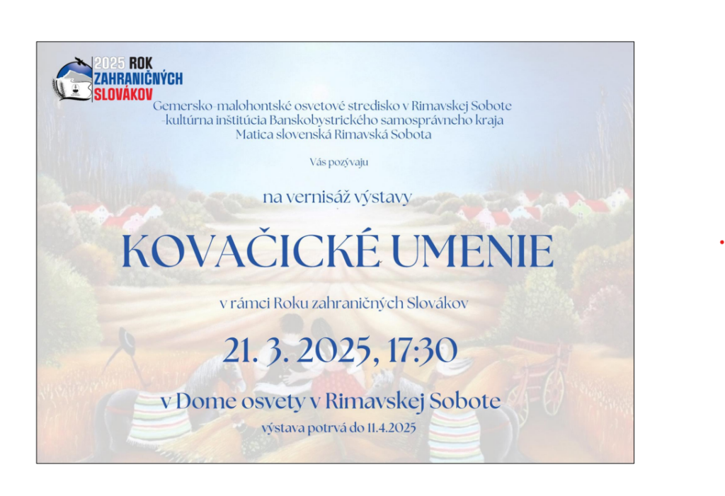 Gemersko-malohontské osvetové stredisko v Rimavskej Sobote a Matica slovenská preto pozývajú všetkých milovníkov umenia na vernisáž výstavy Kovačické umenie, ktorá sa uskutoční 21. marca 2025 o 17:30 v Dome osvety v Rimavskej Sobote.