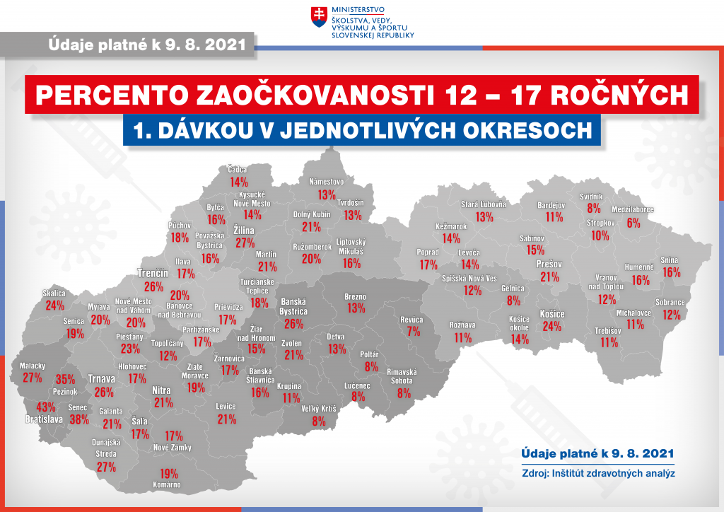 V prípade detí vo veku od 12 do 17 rokov je priemerná zaočkovanosť na úrovni 13 percent a zaočkovanosť celej populácie v kraji presahuje 35 percent.