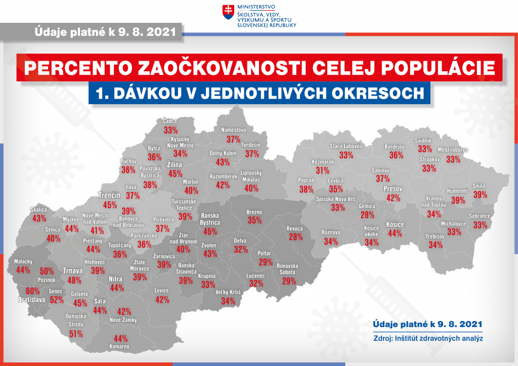 Podľa štatistík z prvej polovice augusta je aspoň jednou dávkou vakcíny v súčasnosti zaočkovaných priemerne 62 percent zamestnancov škôl v Banskobystrickom kraji.