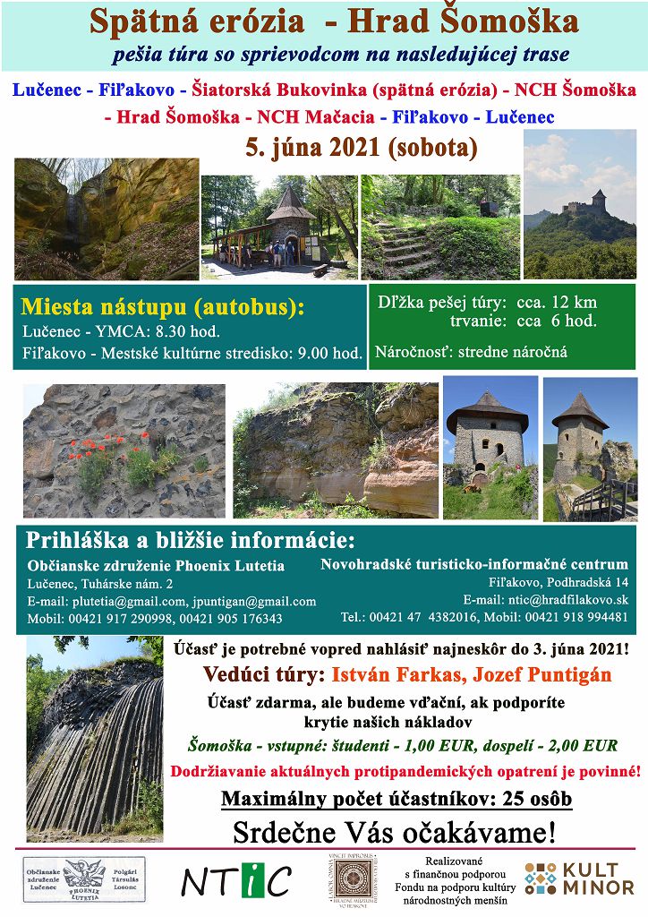 "Vedená pešia túra (realizovaná s finančnou podporou Fondu na podporu kultúry národnostných menšín) sa uskutoční na nasledujúcej trase: Lučenec - Fiľakovo - Šiatorská Bukovinka (spätná erózia) - NCH Šomoška - Hrad Šomoška - NCH Mačacia - Fiľakovo - Lučenec," informoval za organizátorov József Puntigán.