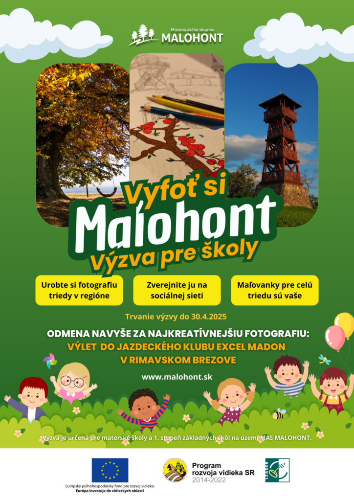 Miestna akčná skupina MALOHONT pozýva školy, aby sa zapojili do výzvy, ktorá umožní objaviť a zdieľať krásy regiónu Gemer-Malohont. Stačí urobiť originálnu fotografiu triedy na zaujímavom mieste v regióne, zdieľať tento zážitok na sociálnej sieti a originálne maľovanky pre všetkých žiakov triedy sú vaše. Výzva prebieha do konca apríla 2025 a v jej závere sa hrá aj o výlet ku koníkom v Rimavskom Brezove.