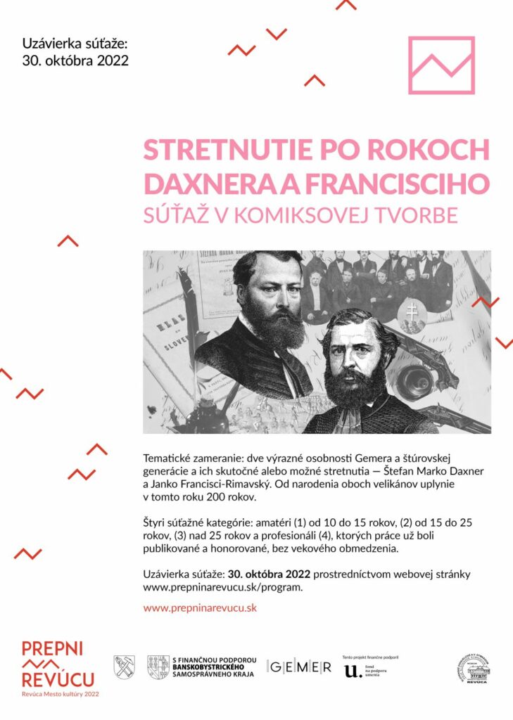 REVÚCA – Mesto Revúca, ktoré je slovenským mestom kultúry 2022, spustilo súťaž v komiksovej tvorbe pre amatérov a profesionálov na tému stretnutia dvoch významných slovenských dejateľov štúrovskej generácie: Štefana Marka Daxnera, rodáka z Tisovca, a Janka Francisci-Rimavského, rodáka z Hnúšte. Obaja mali blízky vzťah k Revúcej a tohto roku si pripomíname 200 rokov od ich narodenia. Uzávierka súťaže je 30. októbra 2022.