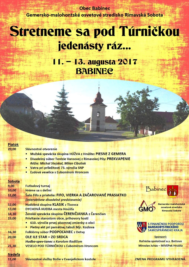Stretnutie pod Túrničkou v Babinci sa bude konať už po jedenásty raz. V piatok 11. augusta sa môžete tešiť na piesne z Gemera, divadelné predstavenie, vatru a ľudovú veselicu. Druhý deň (12.08.) pokračuje futbalovým turnajom, divadlom pre deti, ako aj programom hudobných a speváckych zoskupení z regiónu, ktorý spestrí vystúpenie Folklórneho súboru Podpoľanec z Detvy.