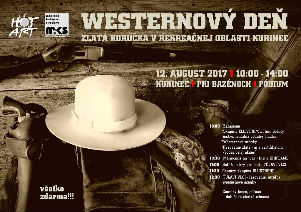 Pre deti aj dospelých v rekreačnej oblasti Kurinec pri Rimavskej Sobote pripravujú Westernový deň. V sobotu, 12. augusta, môžete cez rôzne súťaže, hry, atrakcie, hudbu či tanec zažiť ozajstnú country atmosféru. Nebude chýbať ani ryžovanie zlata, lasovanie, streľba či westernové scénky v podaní Túlavých vlkov. O hudobný program sa postarajú rimavskosobotské country kapely Elektrum a Bluetrend.