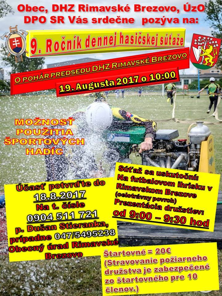 O týždeň neskôr (19.08.) sa v Rimavskom Brezove stretnú milovníci hasičského športu, ktorí si zmerajú sily v dennej hasičskej súťaži o pohár predsedu DHZ Rimavské Brezovo.
