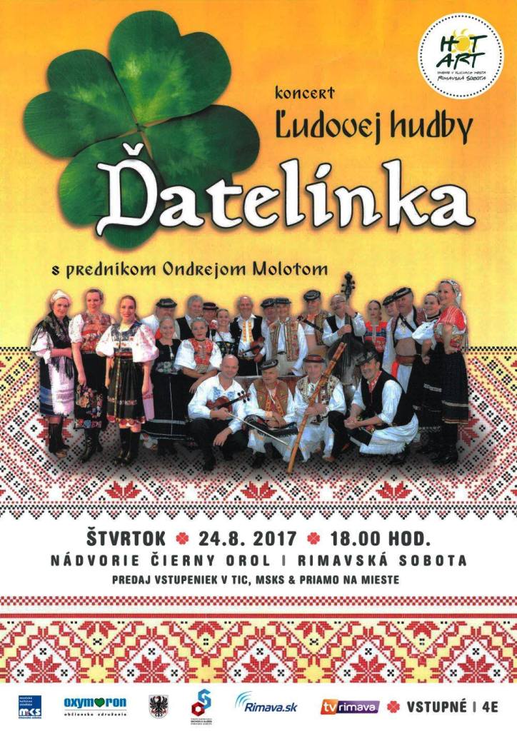 V podobnom duchu sa bude niesť aj koncert Ľudovej hudby Ďatelinka, ktorá so svojimi speváckymi zložkami a sólistami rozozvučí vo štvrtok 24. augusta nádvorie Čierny orol v Rimavskej Sobote. Muzikantské zoskupenie nadväzujúce na tradície podpolianskych sláčikových muzík vzniklo v roku 1971 a dodnes patrí medzi najtypickejšie na Podpoľaní i na celom Slovensku.