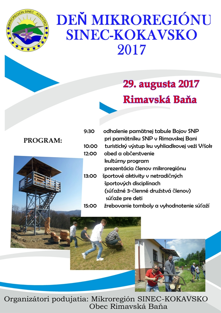 Deň voľna uprostred posledného augustového týždňa (29.08.) môžete stráviť v kruhu zástupcov obcí a priateľov Mikroregiónu Sinec-Kokavsko, ktorí sa stretnú v Rimavskej Bani. Po odhalení pamätnej tabule bojov SNP bude nasledovať turistický výstup k rozhľadni Vŕšok. Súčasťou podujatia bude aj kultúrny program, prezentácia členov mikroregiónu, športové aktivity v netradičných športových disciplínach aj súťaže pre deti.