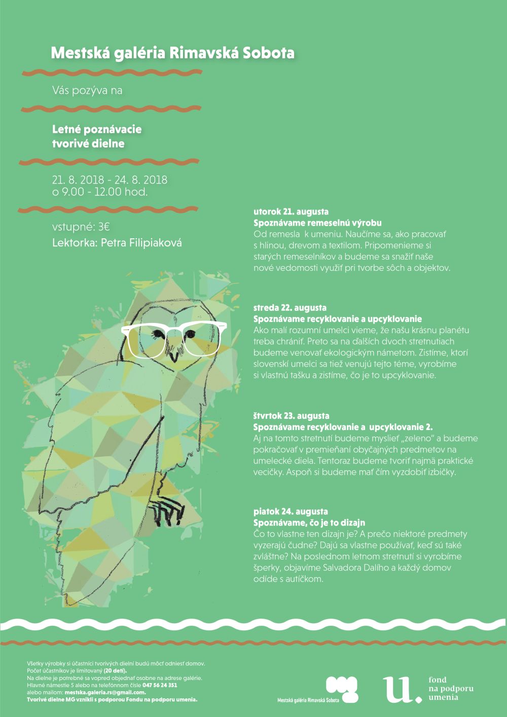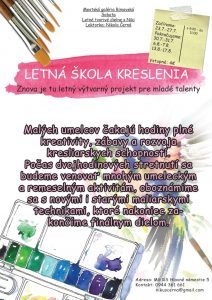Tvorivé dielne vznikli s podporou Fondu na podporu umenia. Mestská galéria pozýva mladých umelcov aj do Letnej školy kreslenia, ktorú bude viesť lektorka Nikola Černá. Mladé talenty čakajú hodiny plné kreativity, zábavy a rozvoja kresliarskych schopností. Počas dvojhodinových stretnutí od 9.00 do 11.00 hod. sa budú venovať mnohým umeleckým a remeselným aktivitám, oboznámia sa s novými i starými maliarskymi technikami, ktoré zakončia finálnym dielom.