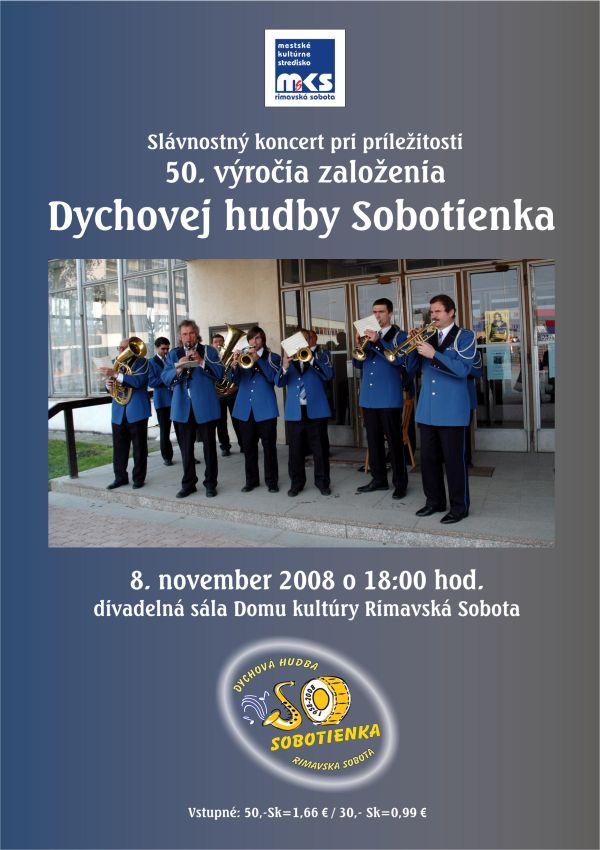 Tento rok si  Dychová hudba (DH) Sobotienka pripomína  50. výročie svojho založenia. Slávnostný koncert pri tejto príležitosti bude v divadelnej sále rimavskosobotského domu kultúry v sobotu, 8. novembra o 18.00 hod. Repertoár Sobotienky, ktorú pozná nielen celý Gemer – Malohont, ale poznajú ju aj v Česku a v Maďarsku, tvoria pochody, promenádne koncertné skladby a úpravy ľudových skladieb.