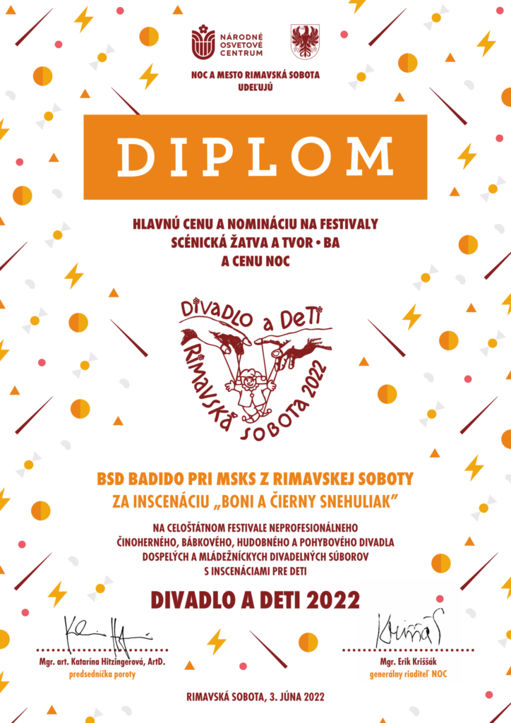 Hlavnú cenu Národného osvetového centra a nomináciu na Scénickú žatvu a na Festival Tvorba v Bratislave získali miestni rimavskosobotskí ochotníci z BS BADIDO za inscenáciu BONI A ČIERNY SNEHULIAK. „Máme nesmiernu radosť, všetkým patrí veľká vďaka, osobitne blahoželám Romanovi Čarnokému, ktorý získal aj špeciálnu cenu za herecký výkon postavy Kapitána Vykuka,“ vyjadrila potešenie Milana Jutková, riaditeľka MsKS, kde súbor pôsobí. Cenu primátora mesta Rimavská Sobota za dramatizáciu textu Nemám rád aristokratky si odniesol DS ZRKADLO Z Kremnice.
