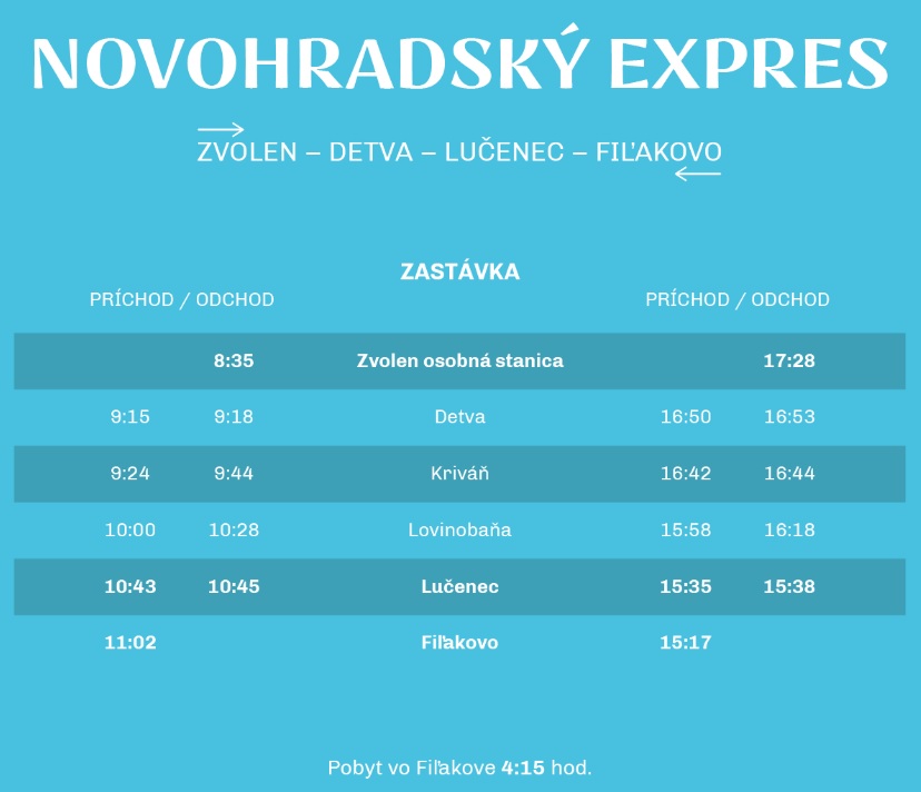 "Historický vlak štartujúci zo Zvolena bude mať zastávky v Detve, v Kriváni, v Lovinobani a v Lučenci. Fiľakovčania budú mať v prípade záujmu možnosť previezť sa po celej trase, respektíve len na niektorom úseku alebo prísť na prehliadku vlaku na železničnú stanicu," doplnili.
