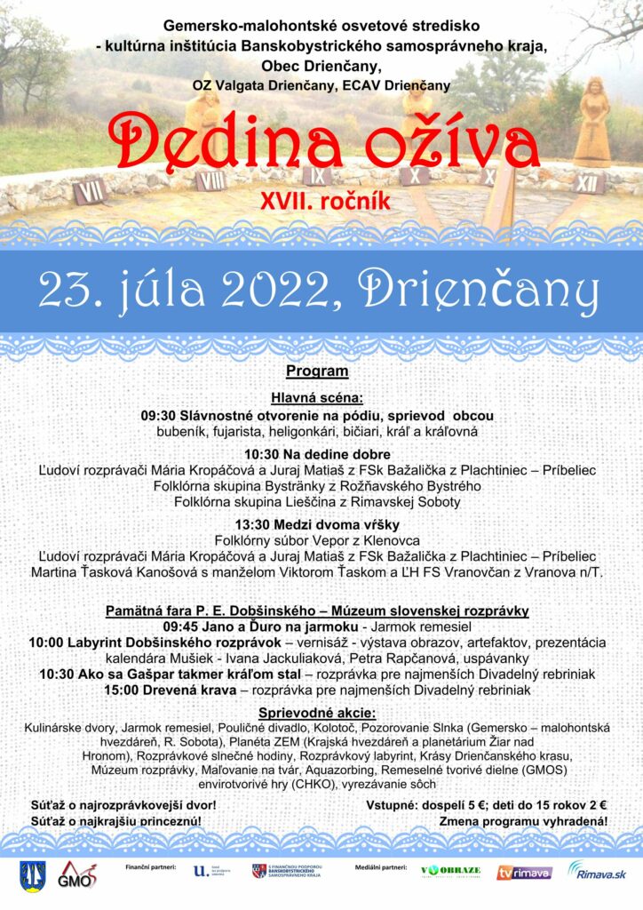 DRIENČANY - Obec Drienčany, Gemersko-malohontské osvetové stredisko, OZ Valgata Drienčany a ECAV Drienčany vás po dvojročnej prestávke pozývajú na 17.ročník podujatia Dedina ožíva.
