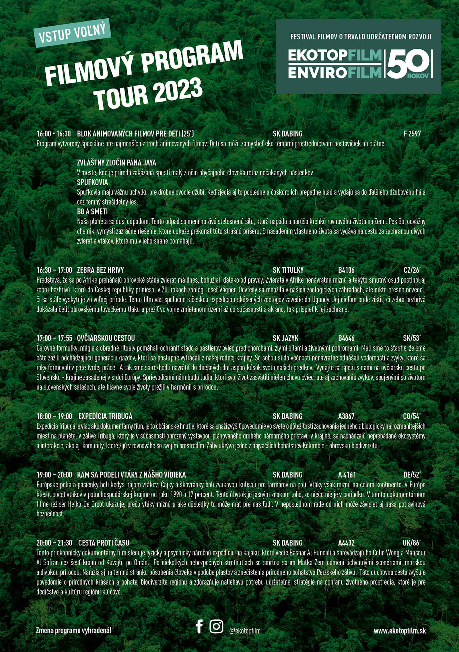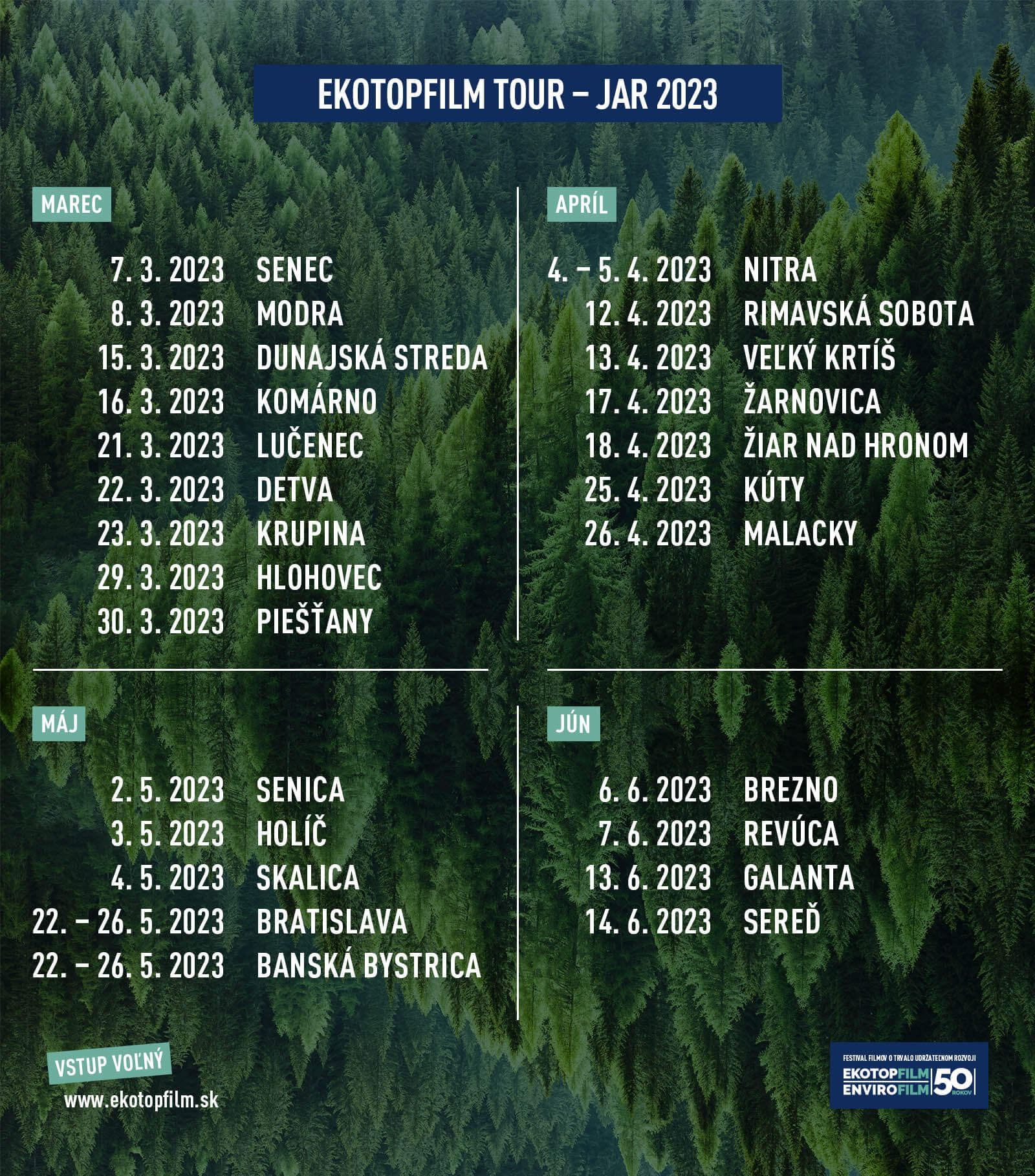 Vytrvalé a neustále silnejúce konzumné správanie ľudí priviedlo zdravie našej planéty do hraničnej krízy. Stojíme na križovatke, na ktorej sa musíme rozhodnúť, či svoje správanie dokážeme zmeniť. Filmový festival Ekotopfilm – Envirofilm prinesie už 12. apríla (streda) do Rimavskej Soboty víťazné dokumentárne filmy festivalu počas svojej tour 2023. Do Revúcej si to festival namieri v júni.