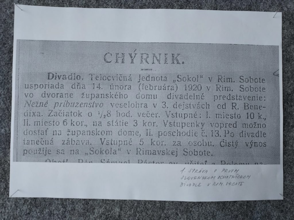 RIMAVSKÁ SOBOTA – Hra Nežné príbuzenstvo bola ako prvá v slovenskom jazyku uvedená miestnymi ochotníkmi v roku 1920. Vtedy sa začali písať dejiny slovenského ochotníctva v Rimavskej Sobote. Po sto rokoch sa opäť vrátila na miestne divadelné dosky.