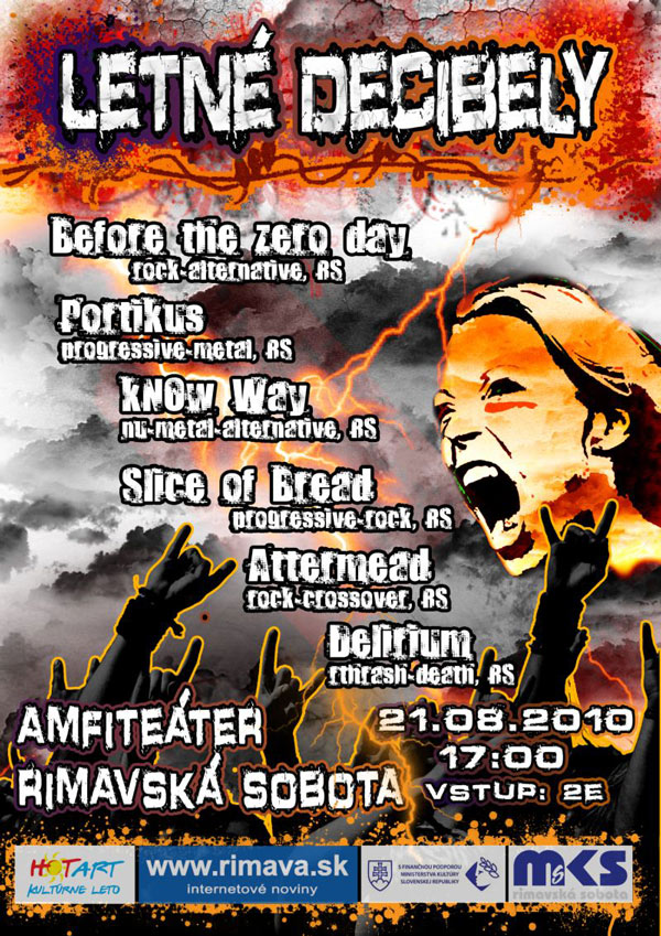 V sobotu, 21. augusta, sa na rimavskosobotskom amfiteátri od 17-tej hodiny vystrieda na pódiu šesť hudobných skupín. “V hodinových vystúpeniach sa na Letných decibeloch predstavia kapely v poradí Slice of Brad, Attermead, Before the Zero day, Know Way, Portikus a kapela DeliriuM,” uviedla pre Rimava.sk Regina Špitálová z Mestského kultúrneho strediska v Rimavskej Sobote. Ako dodala, v prípade nepriaznivého počasia sa koncert uskutoční v Dome kultúry. Viac informácií o kapelách nájdete tu.