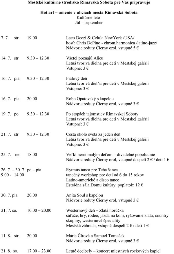 Kultúrne leto Hot Art 2010 potrvá až do septembra. Mestské kultúrne stredisko s finančnou podporou Ministerstva kultúry SR na najbližšie  týždne pripravilo pestrý program zložený z koncertov, divadelných predstavení a tvorivých workshopov. Do Rimavskej Soboty zavíta Anita Soul s kapelou, Mária Čírová a Samuel Tomeček,  Pavol Hammel, Peter Lipa st. + BKK trio + Nu clear trio či Slovenské divadlo tanca s muzikálom Čajočky. Chýbať nebude ani Westernový deň a koncert miestnych rockových kapiel, Letné decibely.