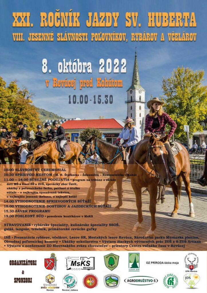21. ročník jazdy Sv. Huberta a 8. ročník jesenných slávností poľovníkov, rybárov a včelárov sa začne o 10-tej hodine slávnostným ceremoniálom, za ktorým bude nasledovať sprievod mestom po uliciach M. R. Štefánika, Železničná, Remeselnícka a Kohút.