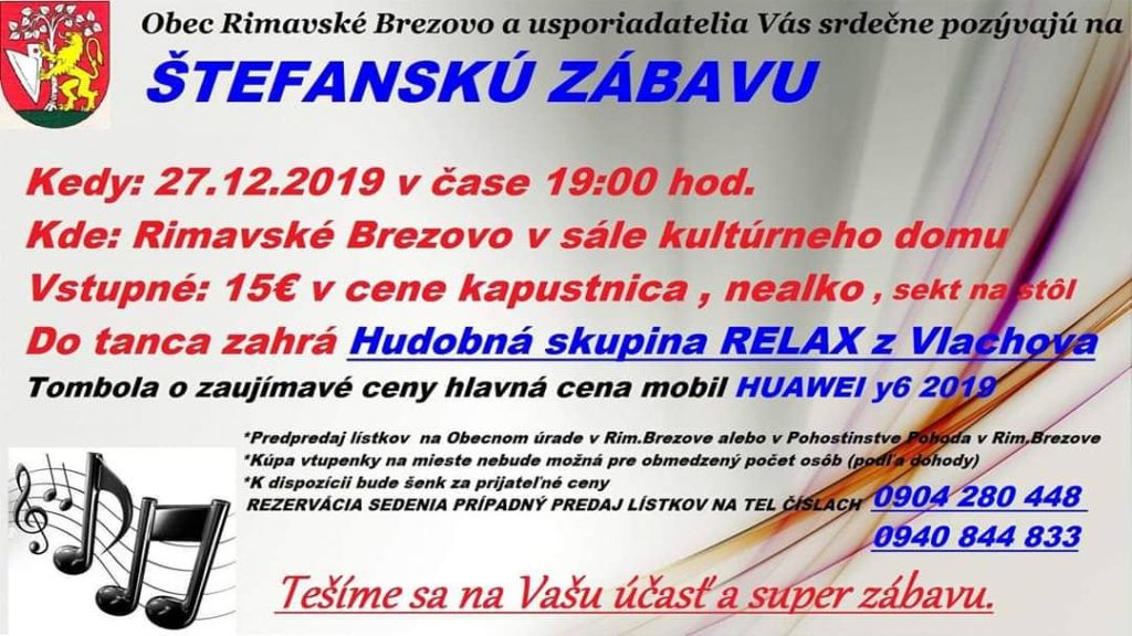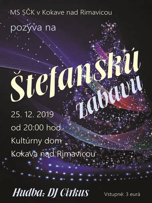 Prvý sviatok vianočný zábavychtivých v meste čaká od 21.00 hod. Štefanská video oldies párty v Montego Clube. Najväčšie hity čias minulých namixuje DJ Dušan Dojčár. Ak Vám diskotéky nič nehovoria na Teplom Vrchu vám do tanca od 20.00 hodiny zahrajú Sendrejovci z Hostišoviec. V ten istý deň chystá Štefanskú zábavu v Kokave nad Rimavicou aj MS SČK.