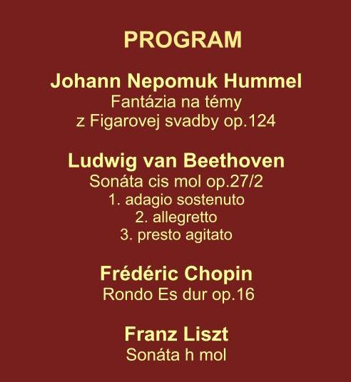 Online prenos klavírneho recitálu v plnom rozsahu tak budú môcť všetci záujemcovia sledovať na FB stránke Mestské kultúrne stredisko Rimavská Sobota v deň konania, teda zajtra, 27. októbra o 20.00 hod. Hodinový koncert bude k nahliadnutiu do nasledujúceho dňa, 28.októbra 2020, do 18.00 hod. Program recitálu je náročný a jedinečne vystavaný. Budete si môcť vypočuť Fantáziu na témy z Figarovej svadby op.124 od J. N. Hummela, Sonátu cis mol op.27/2 L. van Beethovena, Chopinove Rondo Es dur op.16 a Sonátu h mol o F. Liszta.