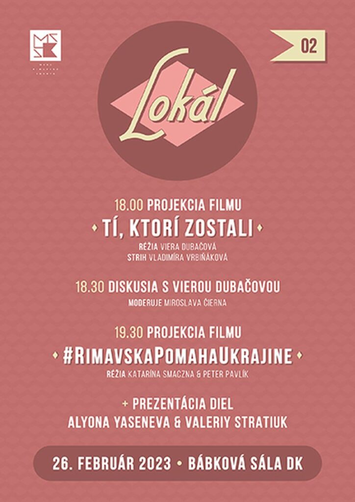 RIMAVSKÁ SOBOTA – LOKÁL je cyklus podujatí, ktorý dáva priestor umelcom z Rimavskej Soboty a priľahlých vesmírov. V nedeľu 26. 2. 2023 od 18.00 hod., sa v bábkovej sále Domu kultúry predstavia ukrajinskí výtvarníci Alyona Yaseneva a Valeriy Stratiuk a rimavskosobotskí filmári Katarína Smaczna a Peter Pavlík s premiérou ich dokumentu #RimavskaPomahaUkrajine. Špeciálnou hostkou večera bude Viera Dubačová, režisérka dokumentárneho cyklu Tí, ktorí zostali. V rámci Lokálu premietnu jeho druhú časť, na ktorej sa ako strihačka podieľala aj Vladimíra Vrbiňáková z Oždian. Vstupné na podujatie je dobrovoľné.