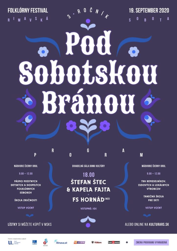 Mestské kultúrne stredisko aj tento rok pripravilo pre všetkých milovníkov tradičnej ľudovej kultúry jednodňový folklórny festival POD SOBOTSKOU BRÁNOU. Nádvorie Čierneho orla tak v sobotu 19. septembra ožije miestnym folklórom, v závere dňa podujatie vyvrcholí vystúpením charizmatického speváka rusínskych ľudových piesní Štefana Šteca a folklórnej skupiny FAJTA v divadelnej sále Domu kultúry o 18.00 hod. Celý program umocnia tanečné vstupy košického FS HORNÁD, účastníkov prvej série úspešnej televíznej šou RTVS – ZEM SPIEVA.