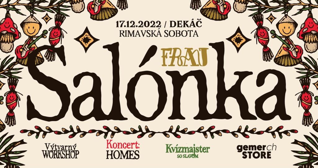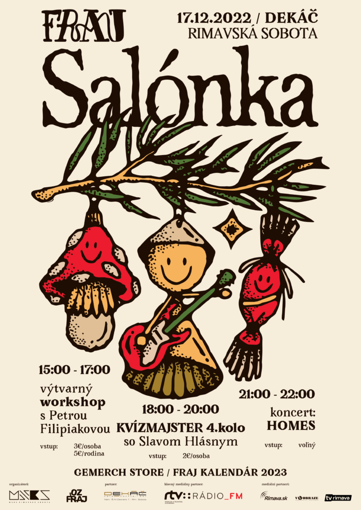 V rámci Salónky si tiež návštevníci budú môcť v Dekáči kúpiť dizajnové produkty regionálnej značky GEMERCH, ale aj FRAJ kalendár na rok 2023 s ilustráciami Nicol Hochholczerovej. Limitovaný kalendár zároveň poslúži ako vstupenka na jubilejný 5. ročník festivalu FRAJ, ktorý sa uskutoční 28. – 29. júla 2023.