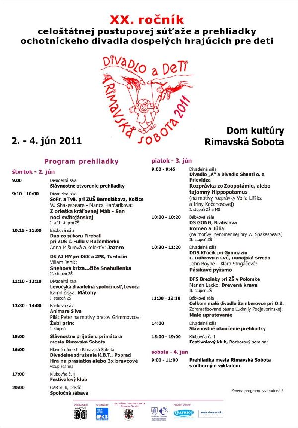 Od 2. do 3. júna sa v priestoroch rimavskosobotského Domu kultúry opäť stretnú priaznivci ochotníckeho divadla z celého Slovenska. Uskutoční sa 20. ročník celoštátnej postupovej súťaže a prehliadky ochotníckeho divadla dospelých hrajúcich pre deti s názvom Divadlo a deti 2011 Rimavská Sobota.