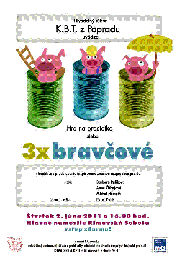 Detské publikum zabavia a rozosmejú vo štvrtok 2. júna o 16:00 hod. na Hlavnom námestí profesionálni herci Divadelného združenia K.B.T. z Popradu interaktívnym predstavením inšpirovaným známou rozprávkou s názvom "Hra na prasiatka alebo 3 x bravčové". Predstavenia sú prístupné okrem škôl aj pre verejnosť.