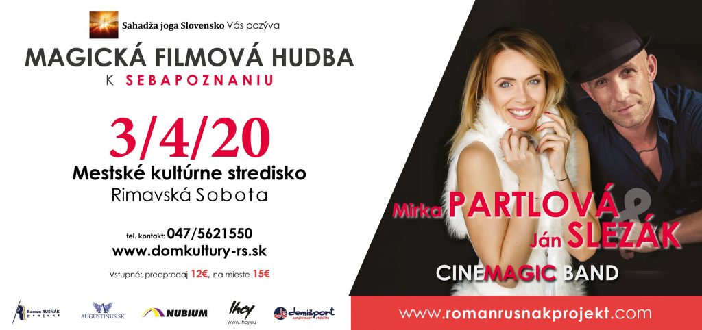 Nájsť si chvíľku pre seba v uponáhľanej dobe, nepodľahnúť stresu, rozjímať, meditovať, trebárs aj pri hudbe, si budete môcť vyskúšať už onedlho aj v Rimavskej Sobote. Zavedie vás k tomu magická filmová hudba. Marcový koncert bol preložený na 2. októbra. „Tešíme sa, že sa nám podarilo nájsť náhradný termín!!“ avizuje spoluorganizátorka podujatia Jana Juhaniaková zo Sahadža joga Slovensko.