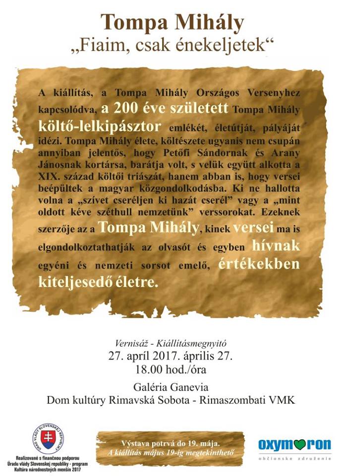 „Tento ročník je výnimočný tým, že si pripomíname 200. výročie narodenia Mihálya Tompu, podľa ktorého je prehliadka pomenovaná. Pri tejto príležitosti OZ Oxymoron pripravil pre účastníkov výstavu s názvom Tompa Mihlály „Fiam, csak énekeljetek“. Jej otvorenie je naplánované v prvý deň podujatia v Galérii Ganevia v Dome kultúry, kde sa prehliadka a súťaž koná,“ povedala Csilla Tóthová, predsedníčka OV Csemadok. Výstava bude otvorená o 18.00 hod., záujemcovia ju budú môcť navštíviť aj po ukončení súťaže do 19. mája 2017.