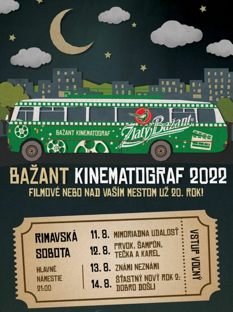 RIMAVSKÁ SOBOTA - Najväčší putovný letný filmový festival Bažant Kinematograf už po neuveriteľný dvadsiaty raz prinesie aj do Rimavskej Soboty výnimočné filmové zážitky pod hviezdnou oblohou. S kolekciou štyroch slovenských a českých filmov sa zastaví v 16 mestách. U nás si ho na Hlavnom námestí budete môcť vychutnať počas letných večerov od 11. – 14. augusta od 21.00 hod. Dvadsiata sezóna prinesie filmy: Mimoriadna udalosť, Prvok, Šampón, Tečka a Karel, Známi neznámi a Šťastný nový rok, tentoraz s podtitulom Dobro došli.