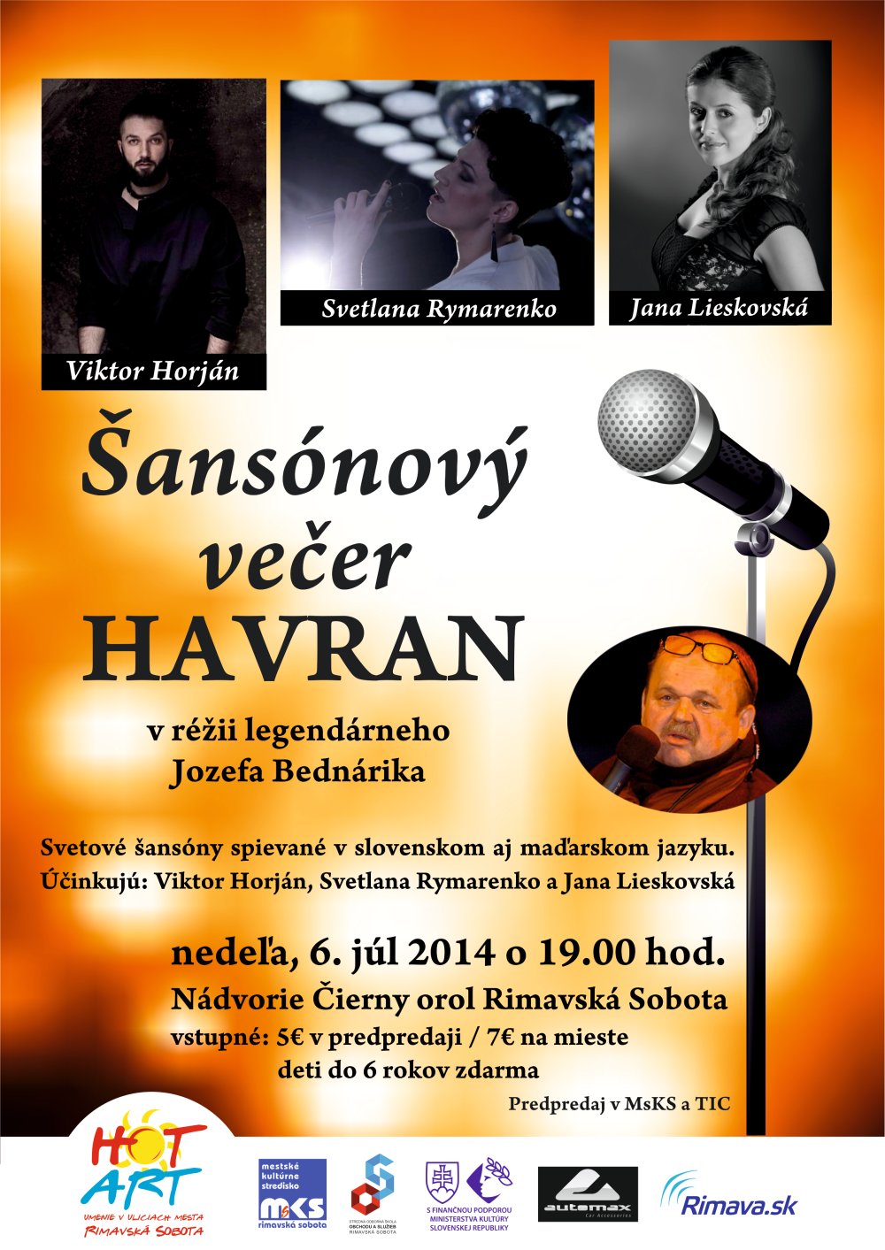 Svetové šansóny v podaní troch skvelých spevákov odznejú v nedeľu večer, 6. júla, na nádvorí Čierny orol v centre Rimavskej Soboty. Šansónový večer Havran v réžii legendárneho Jozefa Bednárika bude zároveň spomienkou na známeho režiséra. Odznejú skladby v slovenčine aj v maďarčine, zaspieva ich Viktor Horján, brilantná speváčka Svetlana Rymarenko a Jana Lieskovská. Podujatie je súčasťou kultúrneho leta HOT ART, začína sa o 19.00 hod.