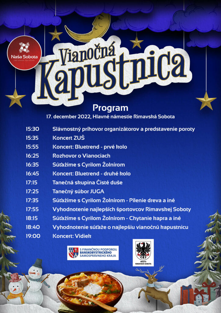RIMAVSKÁ SOBOTA – Už túto sobotu (17. decembra) si na Hlavnom námestí v Rimavskej Sobote rozložia svoje stánky súťažiaci, ktorí sa "pobijú" o titul najlepšie navarenej vianočnej kapustnice v roku 2022.