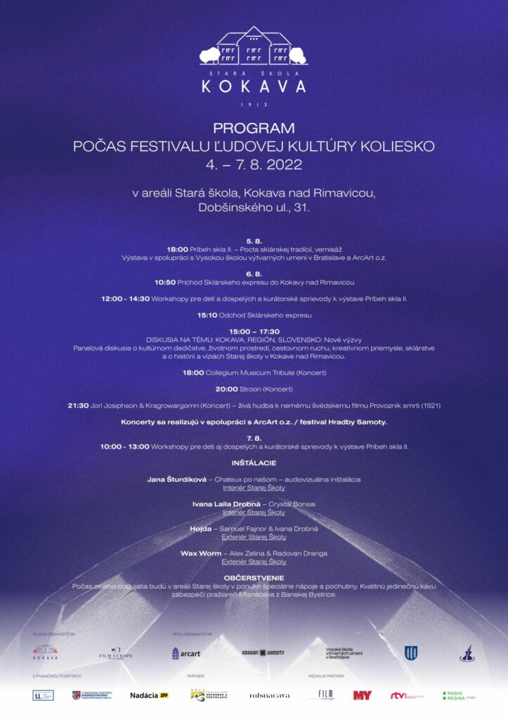 V sobotu 6. 8. od 18.00 vystúpia skupiny Collegium Musicum Tribute, Stroon a na záver Jori Josiphson & Kragrowargomn k nemému švédskemu filmu Povozník smrti z roku 1921. Podujatie doplní panelová diskusia s názvom Kokava, Región, Slovensko: Nové výzvy.