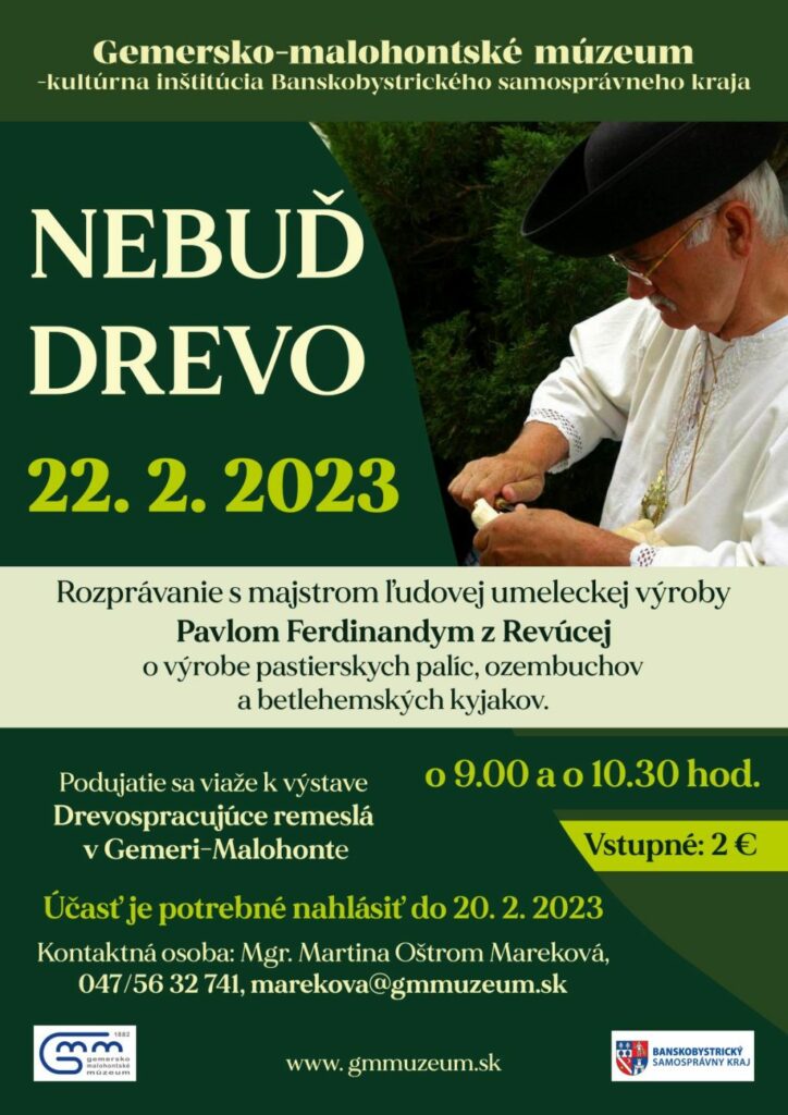 RIMAVSKÁ SOBOTA – V stredu 22. februára 2023 o 9.00 hod. sa v priestoroch Gemersko-malohontského múzea uskutoční podujatie „Nebuď drevo“, počas ktorého sa predstaví majster ľudovej umeleckej výroby Pavel Ferdinandy z Revúcej, ktorý porozpráva o výrobe pastierskych palíc, ozembuchov a betlehemských kyjakov. Podujatie je určené školským skupinám i jednotlivcom.