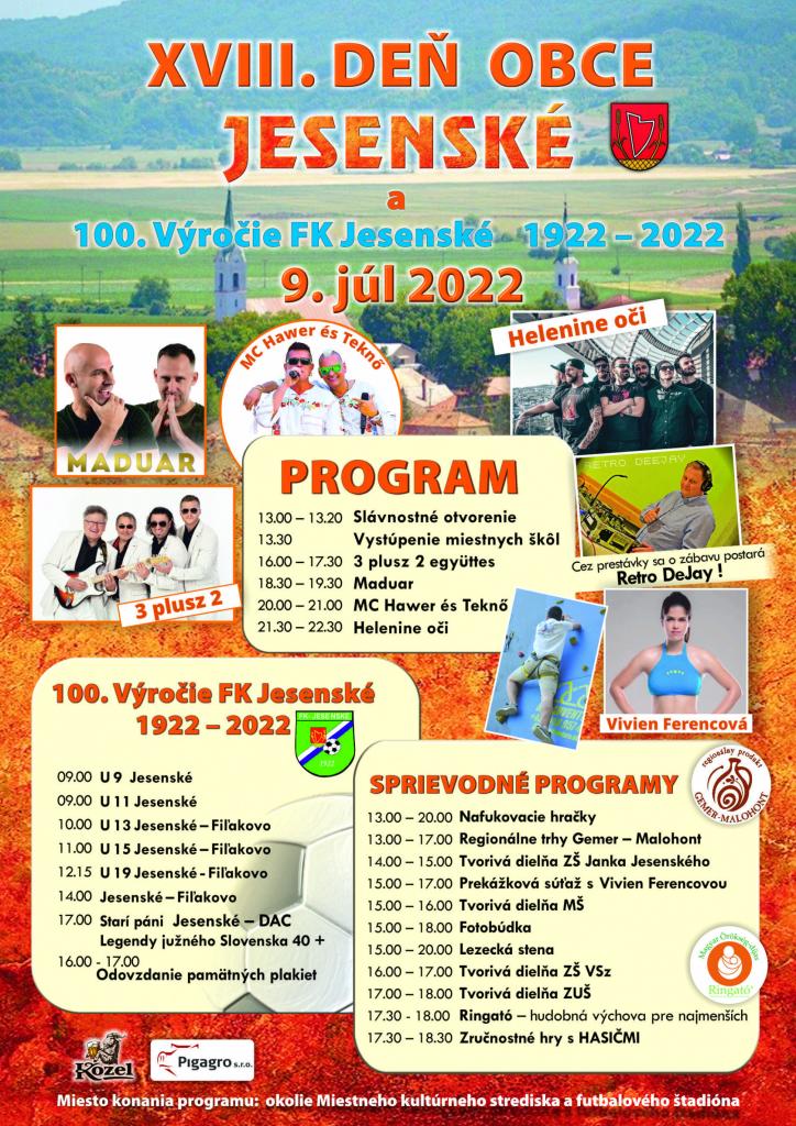 Obec Jesenské opäť oslávi svoj deň obce. Tento rok pripadol na sobotu 9. júla. V rámci 18. ročníka osláv si občania pripomenú aj 100. výročie Futbalového klubu Jesenské zápasmi rôznych vekových kategórií. O 17:00 je naplánovaný zápas starých pánov Jesenského proti DAC legendy južného Slovenska 40+.