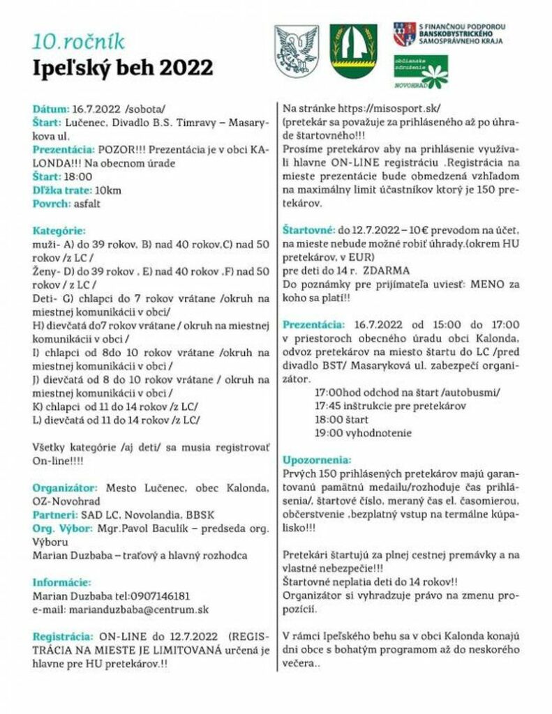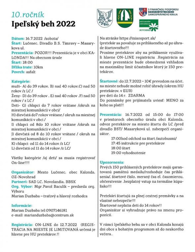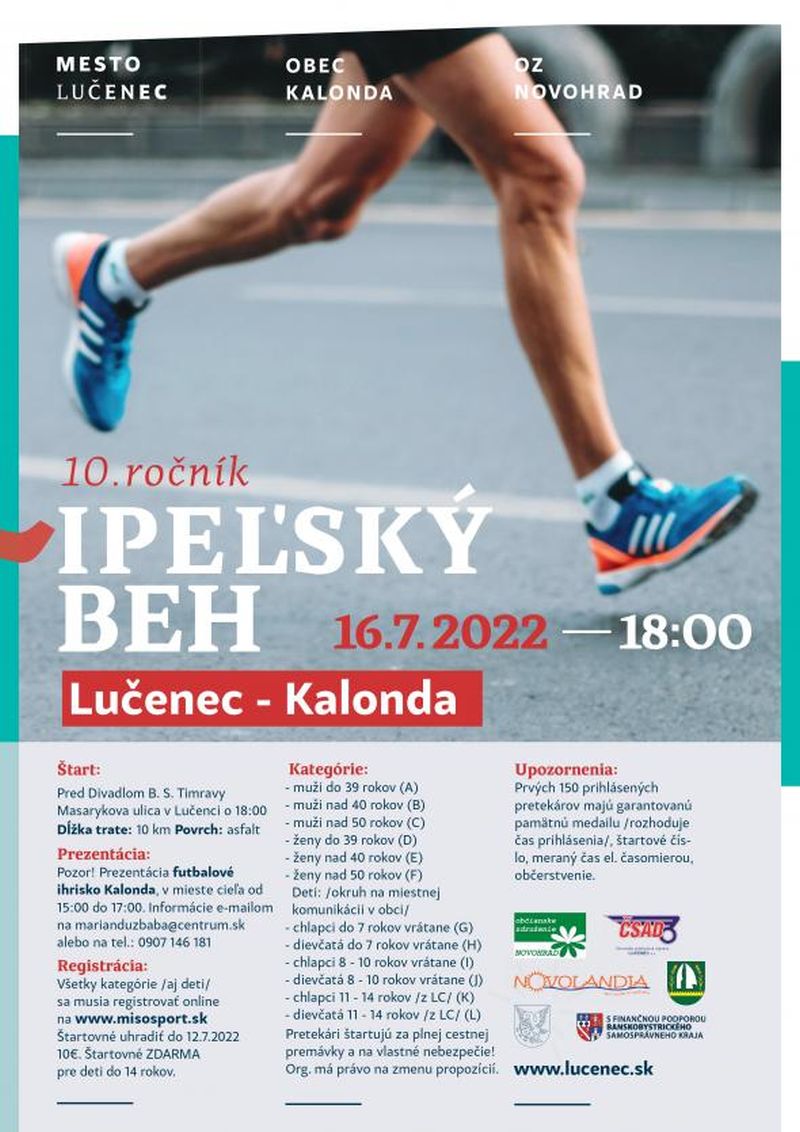 Priaznivci behu sa môžu v sobotu 16. júla zúčastniť jubilejného ročníka Ipeľského behu. Čaká ich 10 kilometrov dlhá trať z Lučenca do Kalondy.