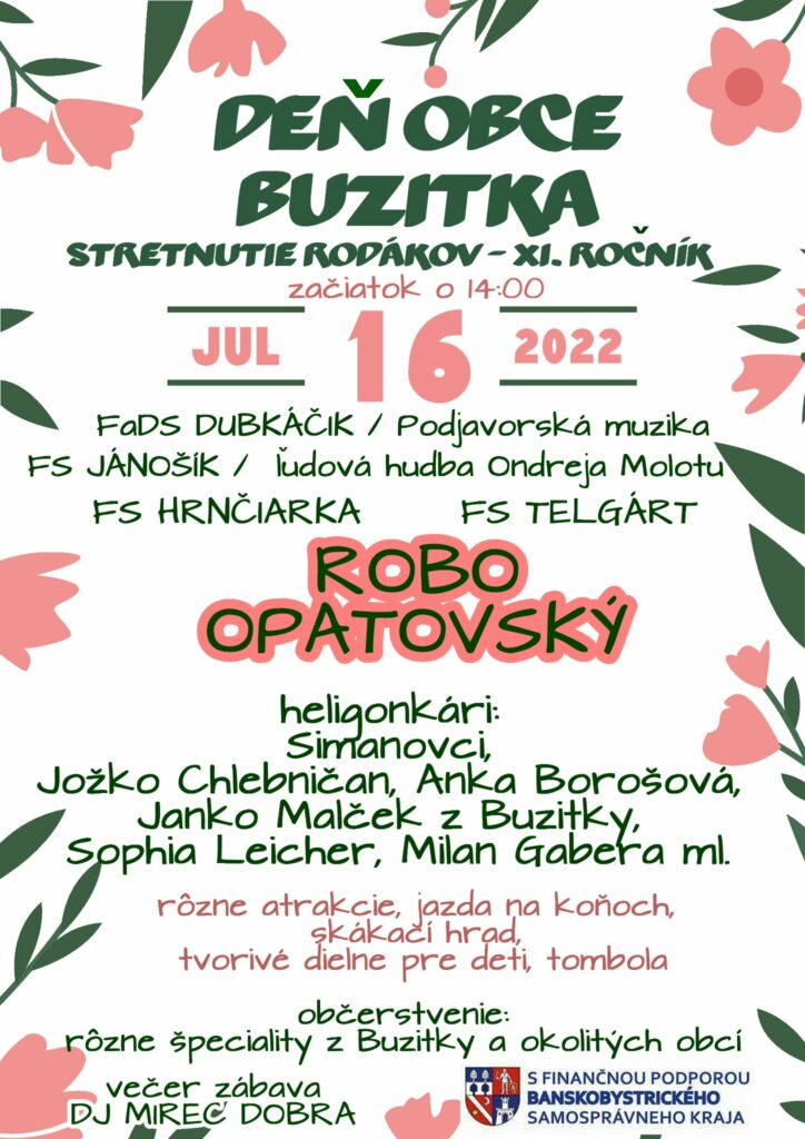 V sobotu (16. 7.) bude v Buzitke veselo. Uskutočnia sa sa tam oslavy dňa obce a jedenásty ročník stretnutia rodákov. Program sa začne popoludní od 14:00 hod.