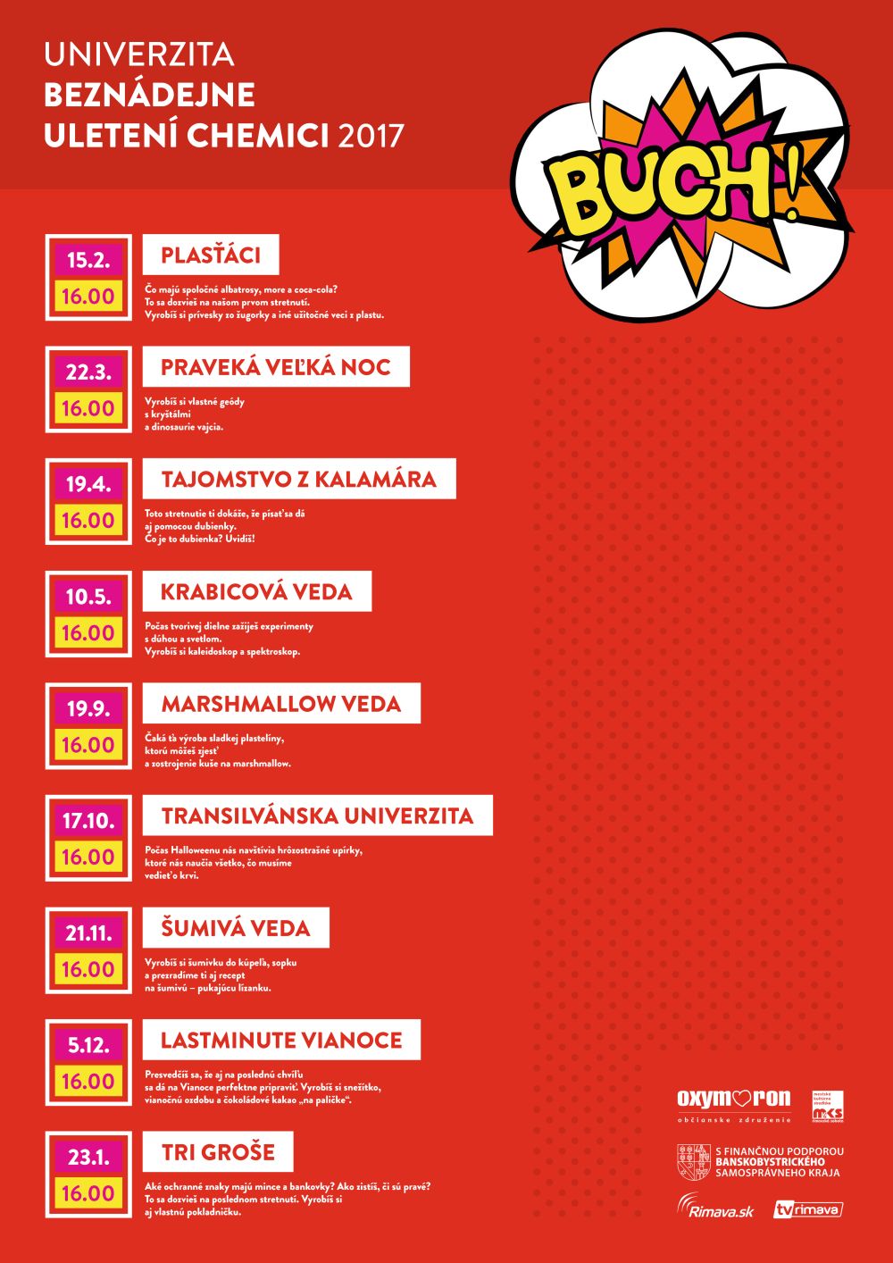 Aj v roku 2017 sa otvárajú brány Univerzity BUCH - Beznádejne uletení chemici, ktorá spája vedu a umenie v slede zaujímavých tvorivých aktivít pre deti. Stretnutia sa uskutočňujú raz do mesiaca, témy, pokusy i aktivity sú veľmi príťažlivé pre deti od 7 do 14 rokov. Vedú ich lektorky s dlhoročnými skúsenosťami - Mgr. Nadežda Miháľová, učiteľka chémie s výtvarným cítením a PaedDr. Eva Talianová, učiteľka výtvarnej výchovy. Prvá aktivita sa uskutoční 15. februára o 16.00 hod. v Dome kultúry, vchod E. Organizátorom je OZ Oxymoron, ktoré projekt uskutočňuje s finančnou podporou Banskobystrického samosprávneho kraja.