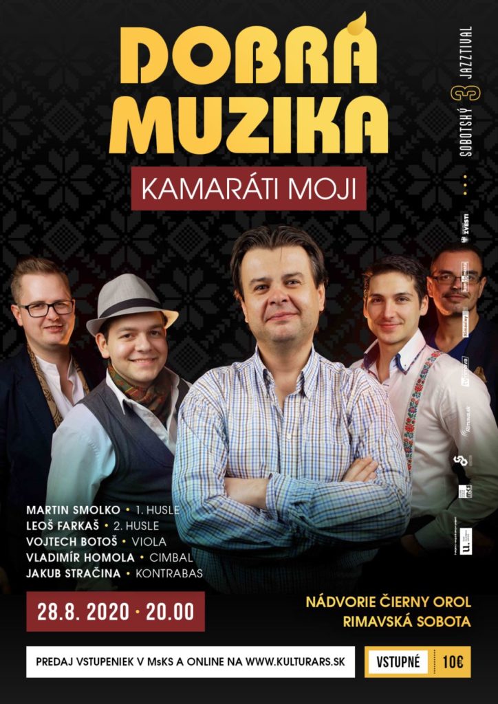 Druhým koncertom tohtoročného Sobotského jazztivalu nazrieme do sveta folklóru a vynikajúcej ľudovej hudby. V piatok 28. augusta o 20.00 hod. v Čiernom orlovi výnimoční muzikanti, zoskupení v kapele DOBRÁ MUZIKA predvedú svoj program „Kamaráti moji“. Podľa organizátorov z MsKS sa diváci môžu tešiť na nový pohľad, na žánrovú pestrosť a nové hudobné štýly v aranžmánoch a v podaní skvelých muzikantov. Primášom je Martin Smolko 1. husle, Leoš Farkaš 2. husle, violista Vojtech Botoš, ktorý pochádza z hudobníckej rodiny Botošovcov z Rimavskej Soboty, Jakub Stračina na kontrabase a Vladimír Homola na cimbale.