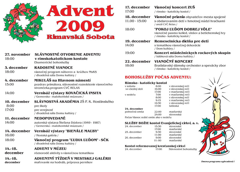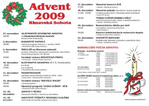 Ekumenické bohoslužby v rímskokatolíckom kostole v piatok, 27. novembra, budú slávnostným zahájením tohtoročného adventu v Rimavskej Sobote. Na bohoslužbách, ktoré začínajú o 18-tej hodine, sa zúčastnia miestni zástupcovia cirkvi ako aj primátor Rimavskej Soboty Štefan Cifruš. Ako ďalej pre Rimava.sk uviedla Tatiana Koniarová z Mestského kultúrneho strediska (MsKS), program Adventu 2009 bude pokračovať vo štvrtok, 3. decembra o 18-tej hodine, kedy sa v divadelnej sále Domu kultúry predstavia súbory a krúžky MsKS.
