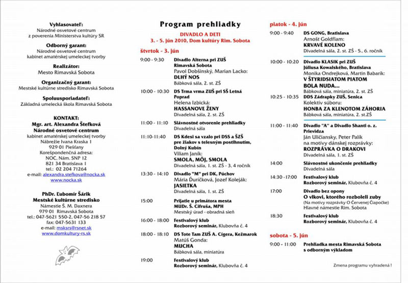 Dom kultúry v Rimavskej Sobote bude v závere budúceho týždňa opäť dejiskom celoštátnej súťažnej prehliadky ochotníckeho divadla dospelých hrajúcich pre deti. Podujatie Divadlo a deti Rimavská Sobota 2010 začne vystúpením domáceho súboru Alterna vo štvrtok, 3. júna, potrvá do soboty, 5. júna.